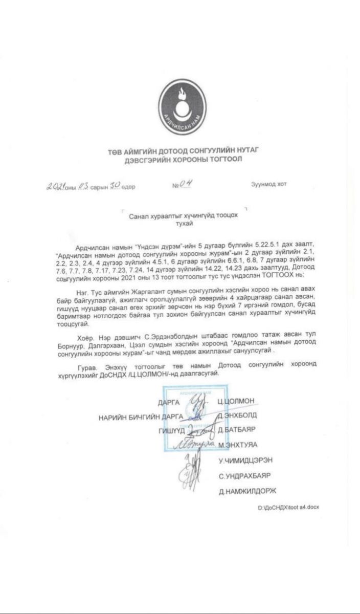 ДАРААХ: АН-ын даргын сонгуулийг намын Үндсэн дүрэм, АН-ын Дотоод сонгуулийн хорооны журмыг зөрчсөн