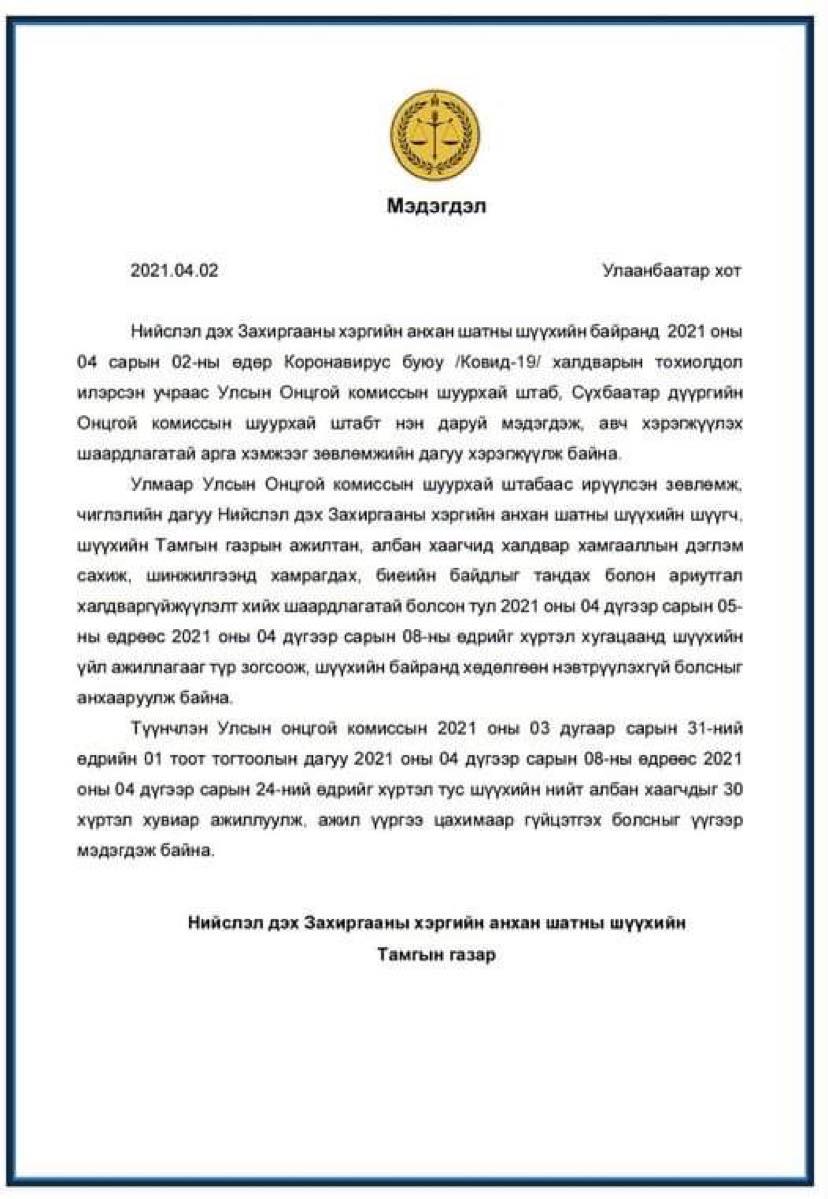 Өнөөдөр /2021.04.02/ Нийслэлийн Захиргааны хэргийн анхан шатны шүүхээс коронавирусний халдвар илэрлээ.