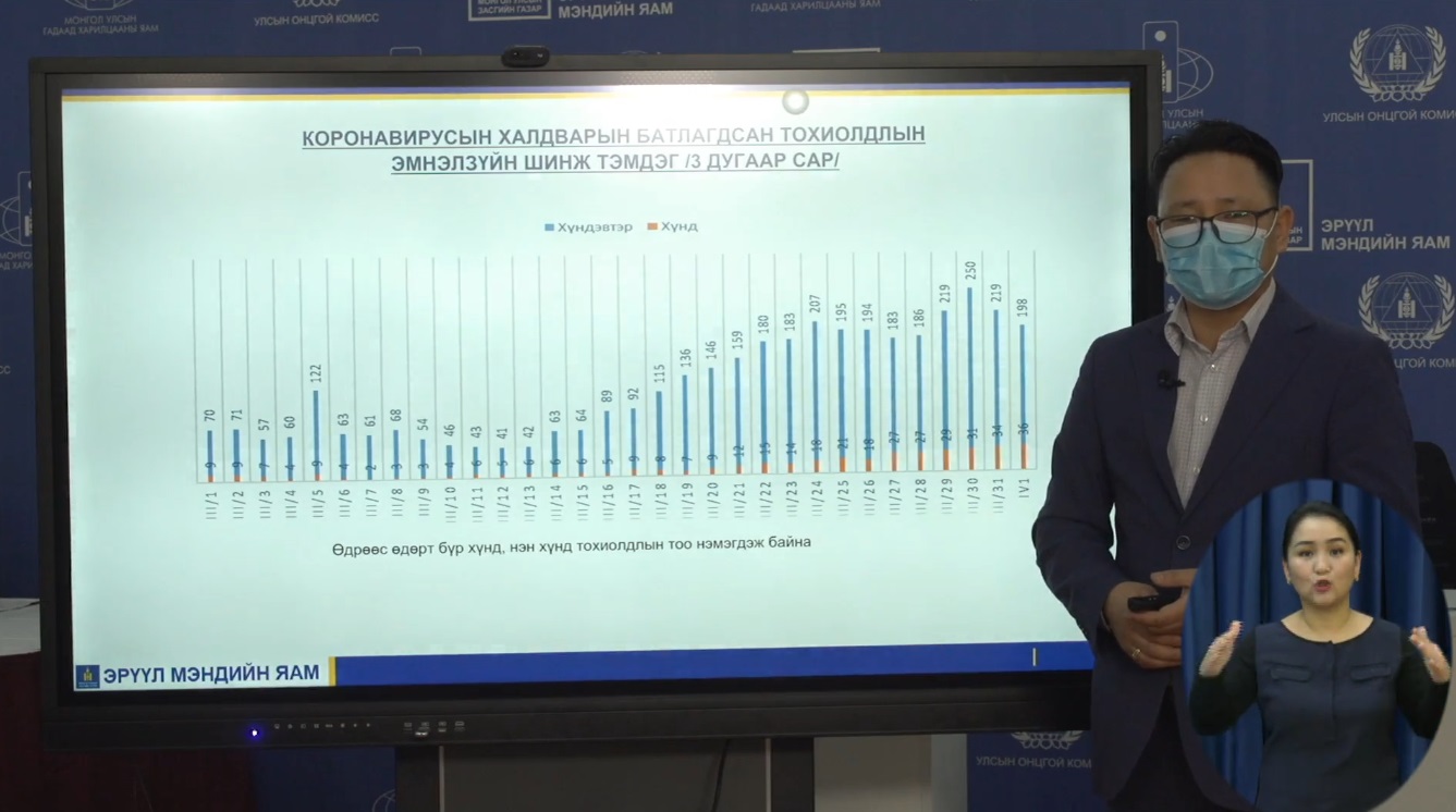 Б.Ууганбаяр: Ерөнхийдөө Ковид-19 халдварын тоо нэмэгдэхийн хэрээр эмнэлэгт байгаа хүндү, хүндэвтэр, маш хүнд хүмүүсийн тоо өсөх хандлагатай байгааг та бүхэндээ анхааруулж байгаа. Тэгэхээр эдгээр хүмүүсийн амь нас, эрүүл мэндийг хамгаалах зайлшгүй шаардлагатай. Ингэхийн тулд эрүүл мэндийн салбар бүх зохицуулалтаа хийж, бүх ажлуудаа амжуулна. Гагцхүү энэ дээр иргэд та бүхний маань дэмжлэг, оролцоо чухал юм аа. Та хайртай хүнээ өвтгөхгүй, амь нас, эрүүл мэндийг нь хамгаалахын тулд бидэнтэй хамтарч ажиллаарай. Таны зүтгэл бидэнд том дэм болно гэдгийг хэлье.