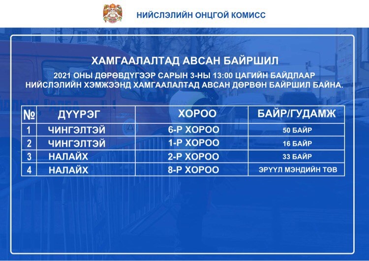 Түүнчлэн өнөөдрийн 13:00 цагийн байдлаар нийслэлийн хэмжээнд хамгаалалтад авсан дөрвөн байршил байна.