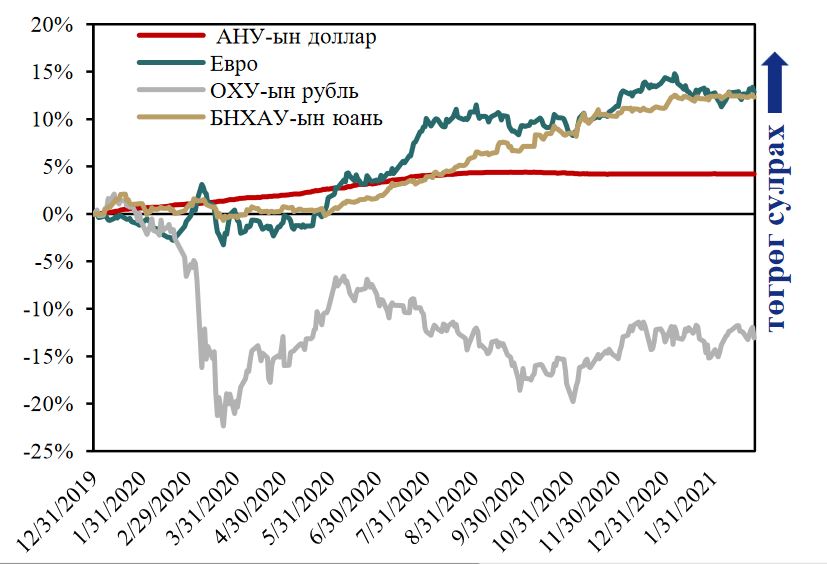 Гадаад худалдааны эргэлтээр жигнэж тооцсон төгрөгийн нэрлэсэн ханш (NEER) 2021 оны нэгдүгээр сард өмнөх оны мөн үеэс 2.8 хувиар суларчээ. Үүнд, төгрөгийн ханш рублийн эсрэг 13.5 хувиар чангарсан ч юанийн эсрэг 11.1 хувь, еврогийн эсрэг 13.9 хувиар суларсан нь нөлөөлжээ.