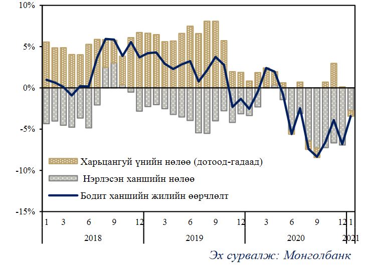 Тодруулбал, эхний хоёр сарын байдлаар нүүрс, төмрийн хүдэр зэрэг экспортын гол бүтээгдэхүүний орлого өмнөх оноос өсч, орох урсгал өмнөх оны мөн үеэс 21 хувиар сайжирч, гарах урсгал 3.5 хувиар буурснаар гадаад валютын урсгал цэвэр дүнгээр 173.2 сая ам.долларын ашигтай гарсан. Мөн хөл хорионы хязгаарлалттай холбоотойгоор эдийн засгийн үйл ажиллагаа хумигдаж, валютын эрэлт буурсан байна.
