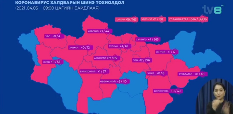Улаанбаатар хотод 514 шинэ тохиолдол бүртгэгдэж, нийслэлд бүртгэгдсэн өвчлөл 8906 боллоо. Харин орон нутагт 88 тохиолдол бүртгэгдэж, халдварын тоо 1358 болоод байна.