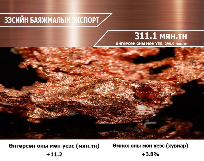 Манай улсын тухайд 2021 он гарснаас хойш гуравдугаар сарын 26-ны өдрийг хүртэлх байдлаар зэсийн экспорт 3.8 хувийн өсөлттэй байгаа. Хоёрдугаар сарын 14-ний байдлаар 9.8 хувийн өсөлттэй байсан. Сүүлийн арав гаруй хоногийн хугацаанд коронавирусний нөлөөллөөр БНХАУ манайхаас зэс, нүүрсний тээвэр хүлээж авахгүй байгаа нь дараа дараагийн үзүүлэлтүүдийг унагах магадлалтай байна.