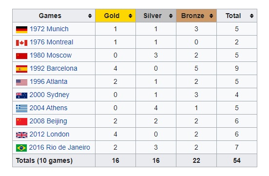 Харин Зуны олимпод 1972 оны Мюнхений наадамд анх оролцож байлаа. Анхны хоёр олимпдоо хоёуланд нь медаль авч байв. Тус улсын тамирчид олимпоос нийт 56 медаль (16 алт, 17 мөнгө, 23 хүрэл медаль) авсан юм.