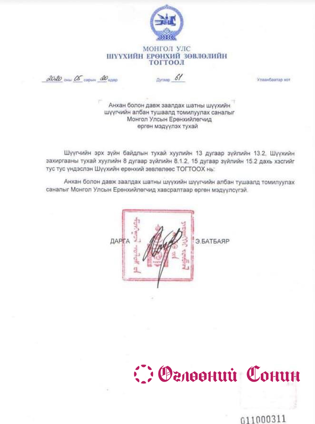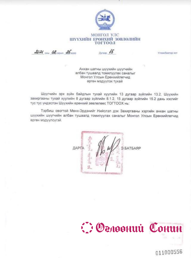 Улмаар албан бичгийн зургуудыг дэлгэжээ. Тэнд дурдсанаар бол Шүүхийн ерөнхий зөвлөлийн 2021 оны хоёрдугаар сарын 25-ны 15 тоот Анхан шатны шүүхийн шүүгчийн албан тушаалтд томилуулах саналыг Монгол Улсын Ерөнхийлөгчид өргөн мэдүүлэх тухай тогтоолд “Шүүгчийн эрх зүйн байдлын тухай хуулийн 8 дугаар зүйлийн 8.1.2, 15 дугаар зүйлийн 15.2 дахь хэсгийг тус тус үндэслэн Шүүхийн ерөнхий зөвлөлөөс тогтоох нь, Тэрбиш овогтой Мөнх-Эрдэнийг нийслэл дэх Захиргааны хэргийн анхан шатны шүүхийн шүүгчийн албан тушаалд томилуулах саналыг Монгол Улсын Ерөнхийлөгчид өргөн мэдүүлсүгэй” гэжээ.