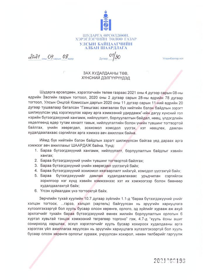 Төрөөс иргэн бүрт 300.000 төгрөг өгөхтэй холбогдуулан ШӨХТГ үнийн хөөрөгдөл, үгсэн хуйвалдаж үнэ тогтоох байдлыг хянан шалгах ажлын хэсгийг байгуулж эхэлжээ.
