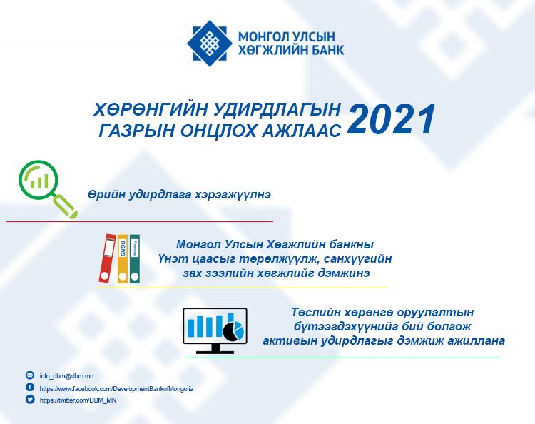 Монгол Улсын Хөгжлийн банкны Хөрөнгийн удирдлагын газраас 2021 онд хийж, хэрэгжүүлэх онцлох ажлын талаарх мэдээллээс хүргэе.