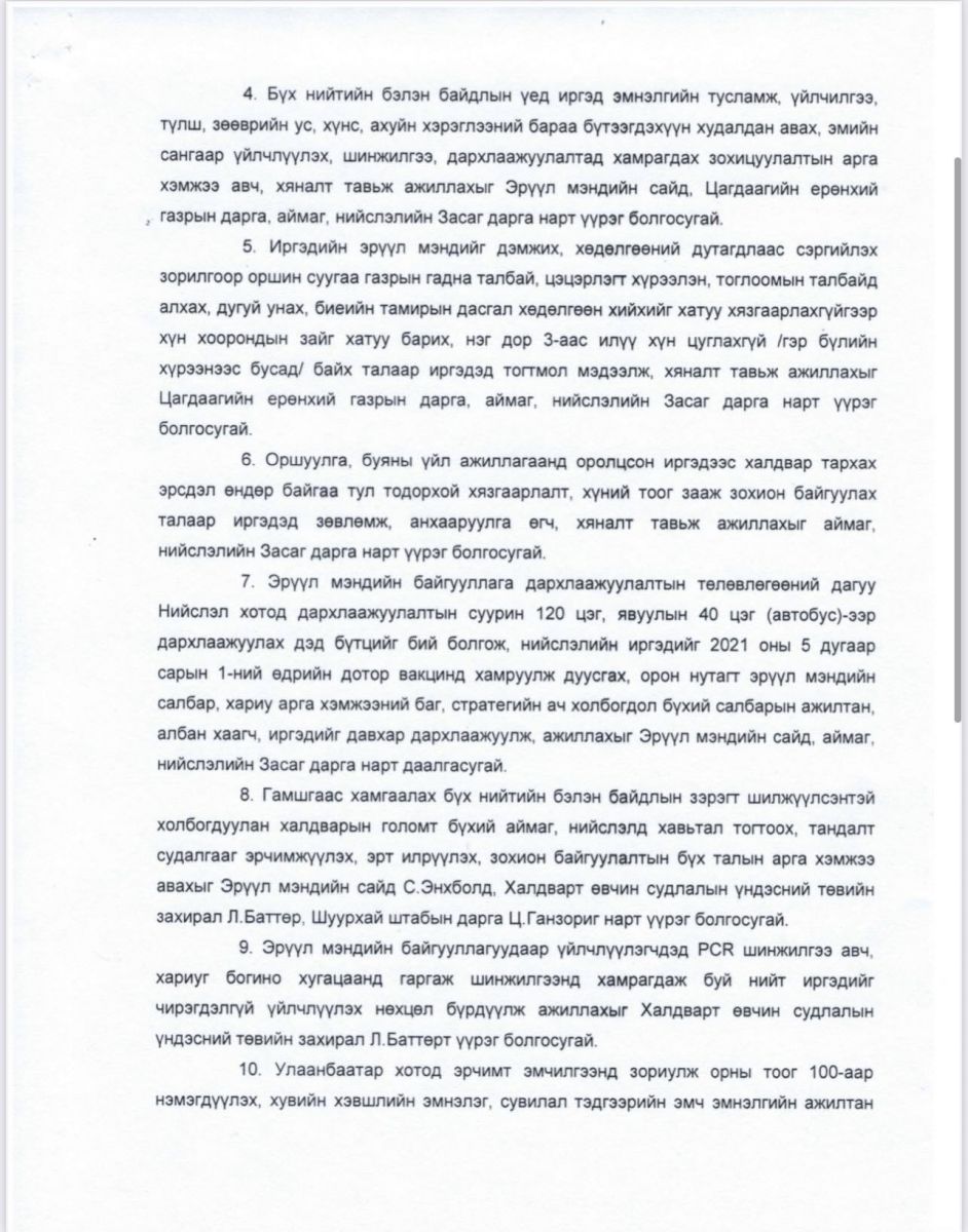 Түүнчлэн тогтоолд хөл хорионы үеэр иргэд оршин суугаа газрын гадна талбайд алхах, дугуй унах нээлттэй ч нэг дор гурваас олон хүн цуглахгүй байхыг үүрэг болгов. Уг асуудлыг нарийвчлан шийдэх үүргийг НОК-д олгосон ба автомашины тэгш сондгойгоор зорчуулах байр суурьтай байгаа аж. НОК энэ асуудлыг эцэслээд, 17:00 цагт мэдээлэл хийх юм.