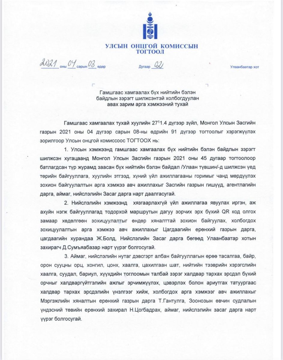 Улсын онцгой комиссын хөл хорио тогтоох шийдвэрээ өчигдөр танилцуулсан. Хатуу хөл хориог дөрөвдүгээр сарын 10-25-ны 06:00 цаг хүртэл тогтоох юм. Ингэхдээ нийслэлийн хэмжээнд хязгаарлахгүй үйл ажиллагаа явуулах иргэн, аж ахуй нэгж байгууллага тодорхой маршрутын дагуу зорчих QR код олгох, 18 градусаас дээш агууламжтай согтууруулах ундааны зүйлс, түүгээр үйлчлэхийг хориглох шийдвэр гарсан билээ.