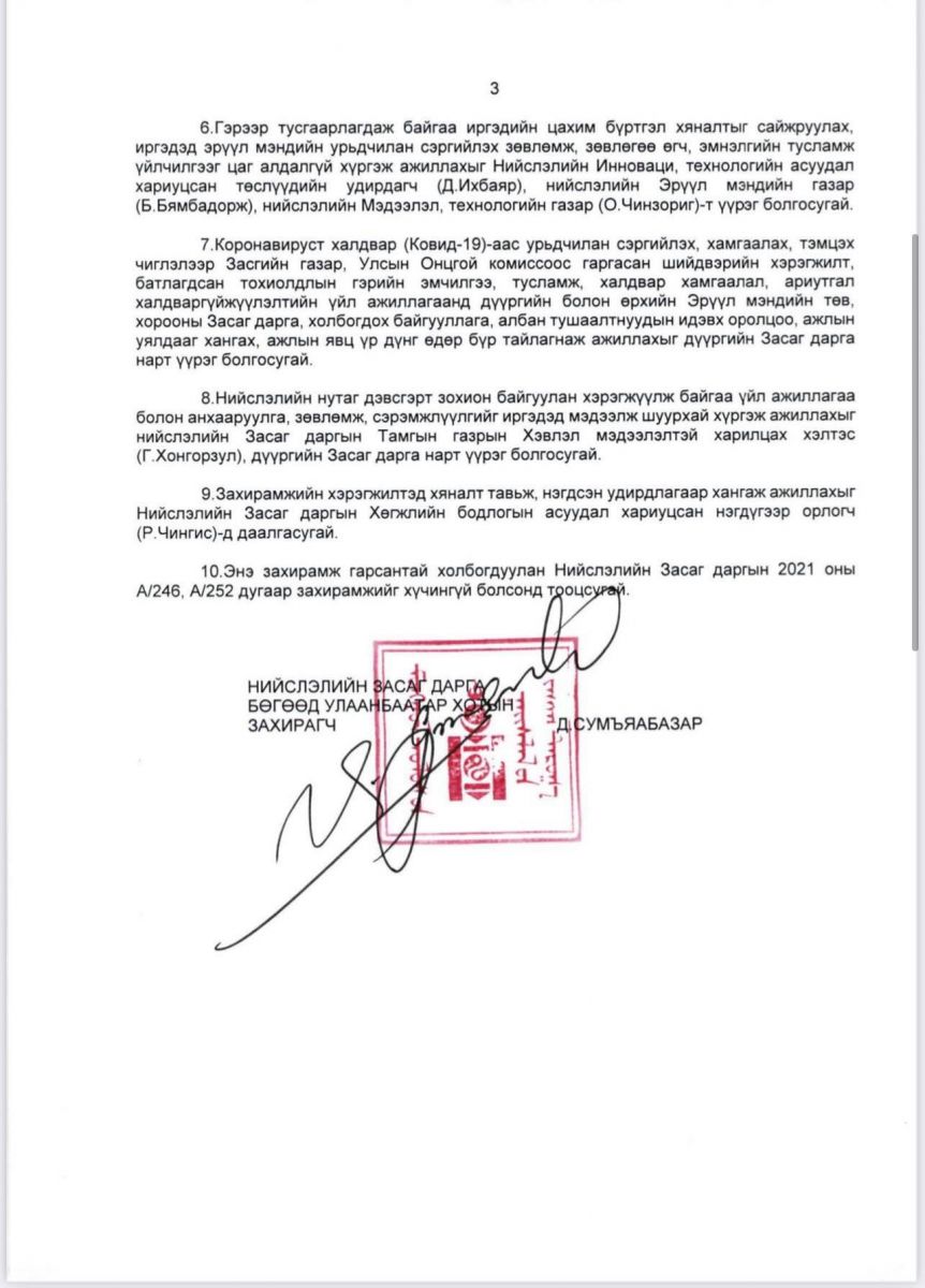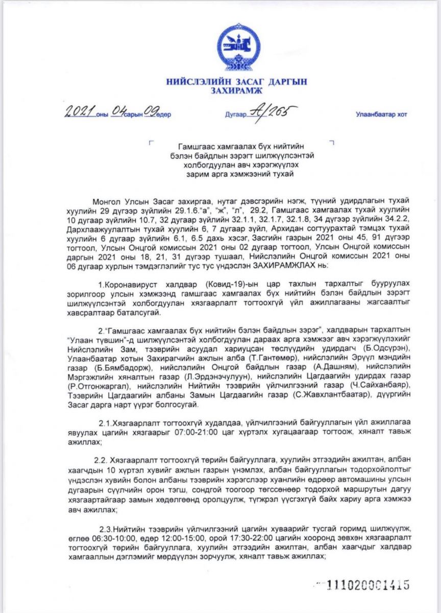 Хөл хорионы үед ямар арга хэмжээ авах талаарх Нийслэлийн Засаг дарга бөгөөд Улаанбаатар хотын захирагч Д.Сумъяабазарын гаргасан захирамжийг БҮРЭН ЭХЭЭР НЬ хүргэж байна.