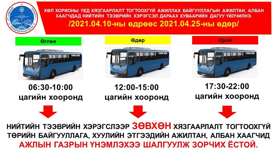 Нийтийн тээврийн автобус зөвхөн хязгаарлалт тогтоохгүй төрийн байгууллага хуулийн этгээдийн ажилтан албан хаагчид ажлын газрын үнэмлэхээ шалгуулж зорчино.