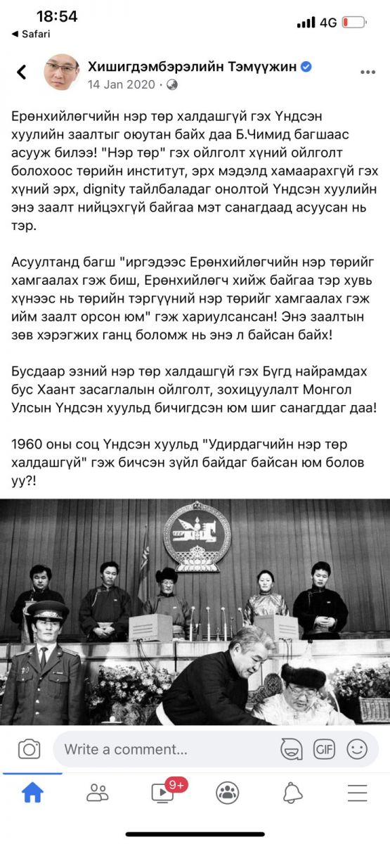 Тодруулбал,  “Нэр төр гэдэг нь хүний   тухай ойлголт болохоос төрийн институт, эрх мэдэлд хамаарахгүй гэх хүний эрх, dignity  тайлбарладаг онолтой Үндсэн хуулийн энэ заалт нийцэхгүй байгаа мэт санагдаад Б.Чимид багшаас асууж байв. Тухайн  үед Б.Чимид багш “Иргэдээс Ерөнхийлөгчийн нэр төрийг хамгаалах гэж биш, Ерөнхийлөгч хийж байгаа тэр хувь хүнээс нь Төрийн тэргүүний нэр төрийг хамгаалах гэж ийм заалтыг оруулсан юм” гэж хариулсан” хэмээж байв. Үүнээс үзэхэд Ерөнхийлөгч Х.Баттулга төрийн институтыг өмчлөх хүсэлдээ дийлдэн,  хувийн улс төр хийж эхэлсэн  нь энэ  болжээ.