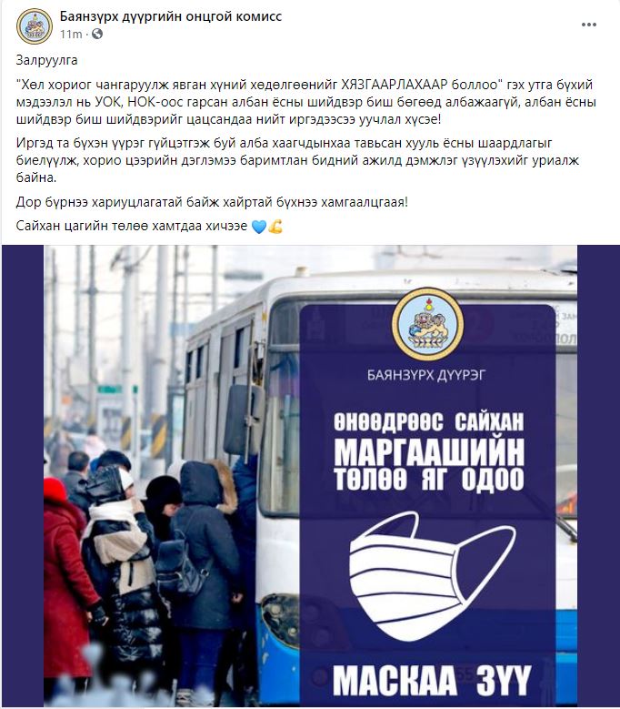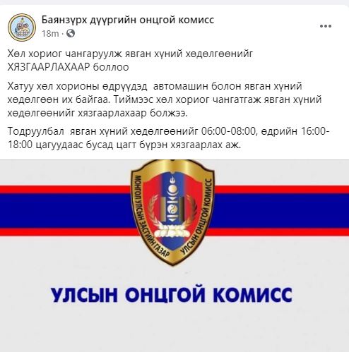 Хатуу хөл хорионы өдрүүдэд автомашин болон явган хүний хөдөлгөөн их байгаа тул хөл хориог чангатгаж, явган хүний хөдөлгөөнийг 06:00-08:00, өдрийн 16:00-18:00 цагуудаас бусад цагт бүрэн хязгаарлах шийдвэр гаргасан талаар Баянзүрх дүүргийн Онцгой комисс мэдээлснийг эх сурвалж болгон хүргэсэн билээ.
