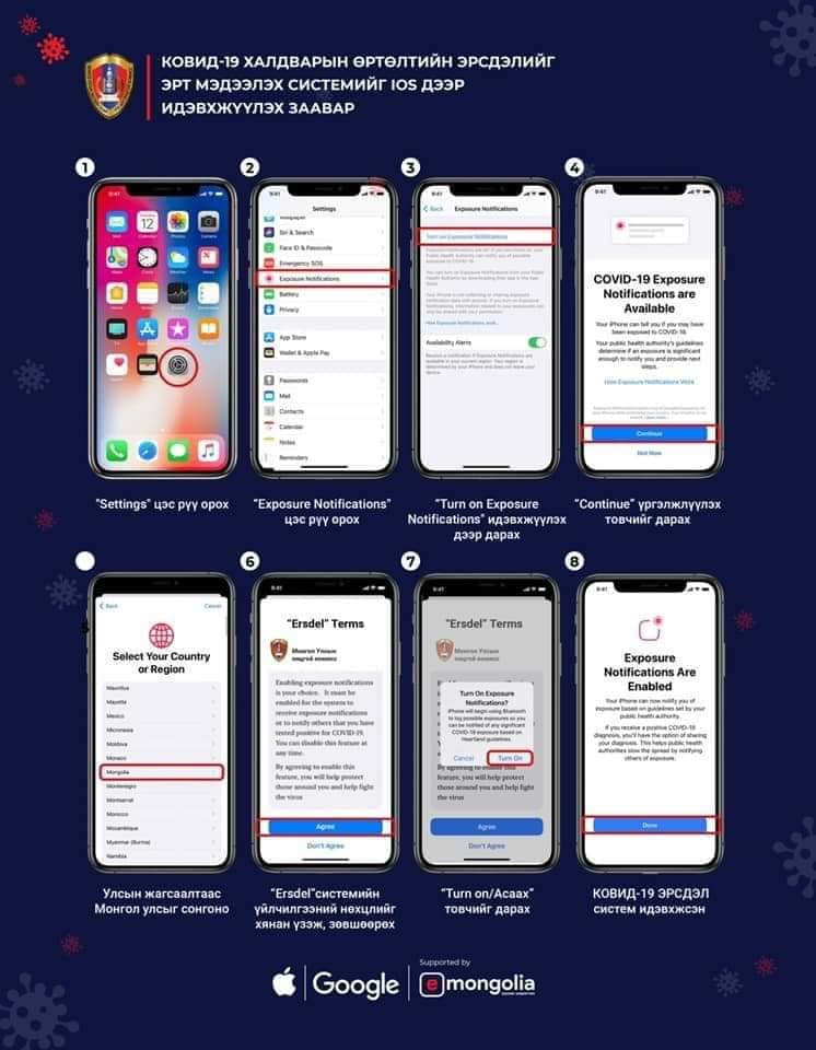 Өнөөдөр буюу 04 дүгээр сарын 19-ний өглөө Монгол Улсын иргэн бүрийн ухаалаг гар утсанд Google болон Apple компаниас мэдэгдэл очих болно. Үүнийг та цочирдолгүй хүлээн авч, зааврын дагуу COVID-19 ERSDEL системийг гар утсандаа суулгаарай.