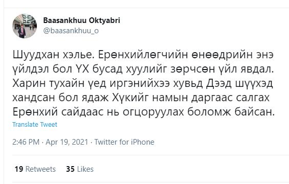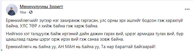 Женко дураз маш аюултай хүн юм аа. Өөриын хувийн эрх ашгийн төлөө улс орноо ч сарниулж мэдэх новш байж. Энэ суудлаа өгчихөөр нүгэл нь нүдээрээ гарах гээд амь нь тэмцэж бна. Иргэдээ талцуулж турхирдаг улсын удирдагч монголын түүхэнд даанч байхгүй дээ. Их муу хүн юм аа