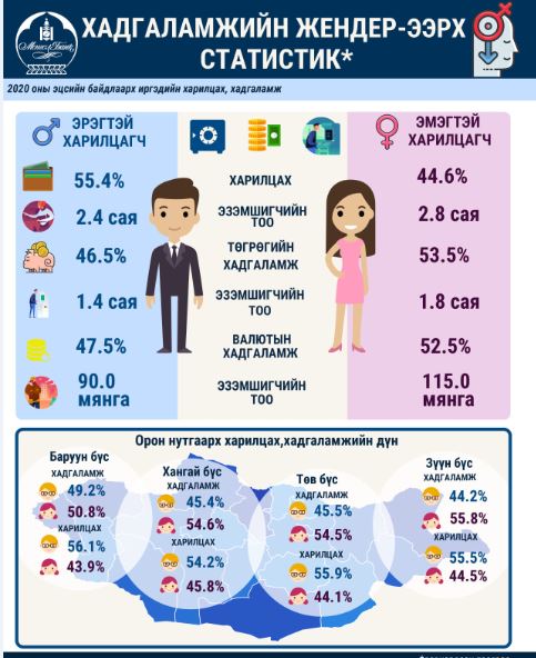 Мөн 2020 оны эцсийн байдлаарх иргэдийн харилцах, хадгаламжийн жендерээрх статистик мэдээллийг хүргэж байна. Төгрөгийн хадгаламжийн 53.5 хувь эмэгтэй харилцагчдад ногдож буй бол валютын хадгаламжийн 52.5 хувь мөн эмэгтэй харилцагдад ногдож байна. Харин харилцах дансны 55.4 хувь эрэгтэй харилцагчдад ногдож буй аж.