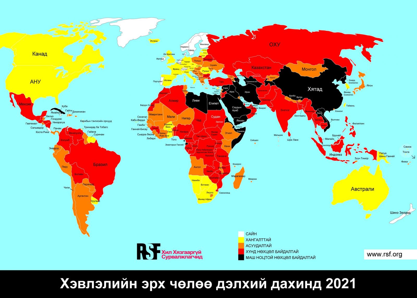 “Хил хязгааргүй сурвалжлагчид” байгууллагаас гаргадаг дэлхийн үзүүлэлтээр дэлхий даяарх хэвлэлийн эрх чөлөөний түвшин 2021 онд 2020 оныхоос дөнгөж 0.3 хувиар буурсан байна. Гэвч өнгөрсөн жилийн харьцангүй тогтвортой байдал нь 2013 онд уг үнэлгээг хэрэглэж эхэлснээс хойш дээрх үзүүлэлт 12 хувиар доройтсон гэдгийг анхаарахгүй өнгөрч болохгүй.