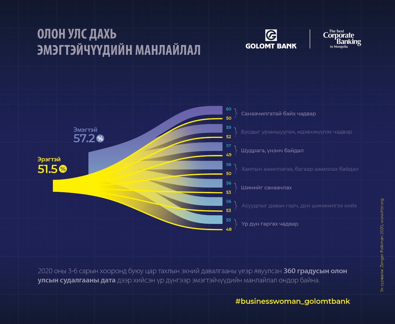 Улс орны хөгжлийг урагш түрдэг, баялаг бүтээгчид болох бизнес эрхлэгчдийн цар тахлын үед туулж буй бэрхшээл, замналыг бид багагүй сонсож байгаа. Тэр дундаа эмэгтэй бизнес эрхлэгчдийг онцолмоор. Учир нь эрчүүдтэй харьцуулахад бизнесээ эхлүүлэх, түүний тулд хөрөнгө босгох, дэмжлэг авах, удаан хугацаанд амжилттай авч явах тал дээр эмэгтэй бизнес эрхлэгчдэд илүү хүндрэлтэй байдаг тухай олон судалгаа бий. Гэхдээ Harvard Business Review-ээс саяхан гаргасан судалгаагаар эмэгтэй бизнес эрхлэгчдийг бэрхшээлтэй нүүр тулах үедээ тогтвортой байдлаа хадгалах, манлайлах тал дээр эрчүүдээс илүү үзүүлэлттэй байгааг харуулжээ.