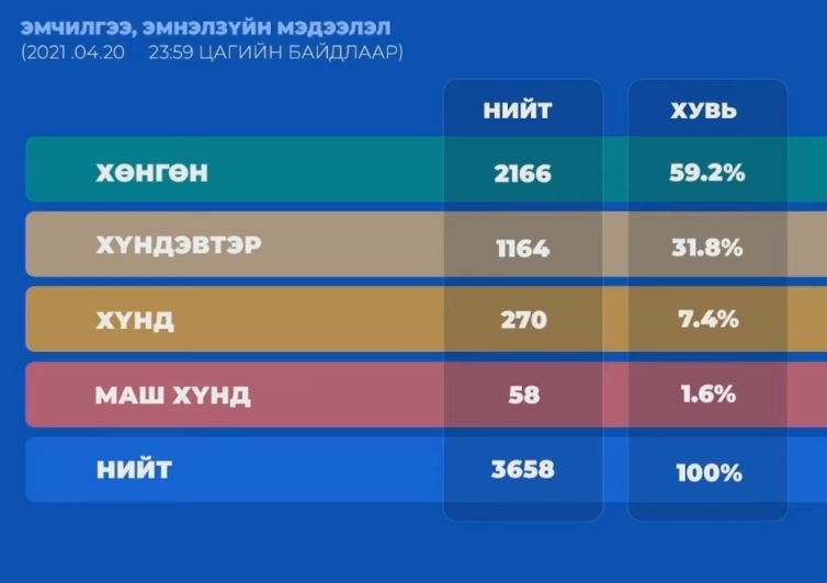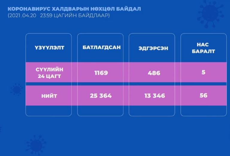 Сүүлийн 24 цагт 15.005 хүнээс шинжилгээ авахад коронавируст халдварын 1169 шинэ тохиолдол бүртгэгдэж, Монгол Улсын хэмжээнд нийт халдварын тохиолдол 25.364 боллоо. Мөн хугацаанд ковидын улмаас таван хүн нас барж, нас баралтын тоо 56 болсон харамсалтай мэдээ байна.