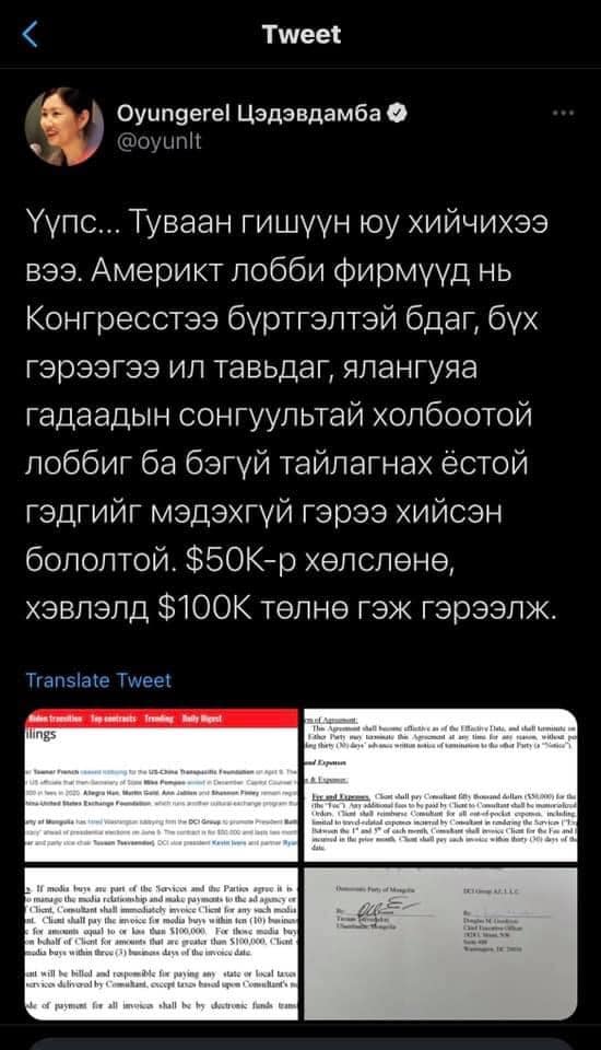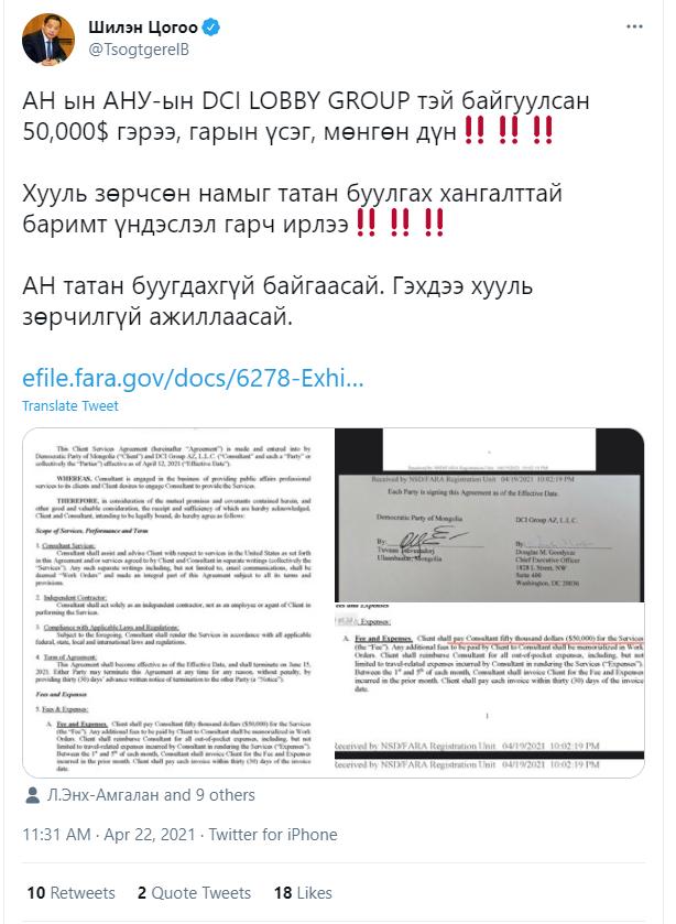 Тодруулбал, АН-ынхан Ерөнхийлөгчийн ээлжит сонгуульд нөлөөлөх зорилгоор АНУ-ын DCI компанитай 50 мянган ам.долларын гэрээ хийсэн гэх мэдээллийг гишүүд задлав.