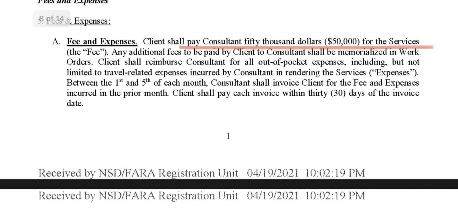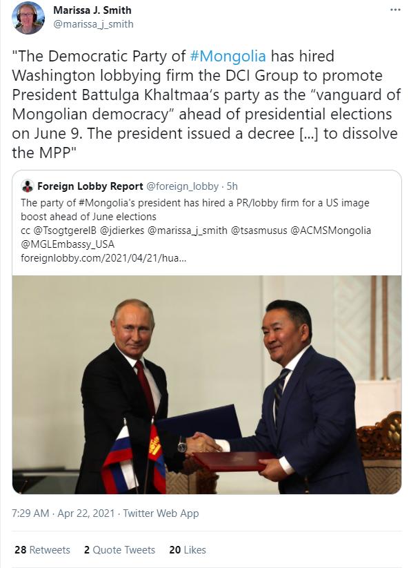 Тодруулбал, Олон улсын хууль бус лоббиг ил болгодог Foreign Lobby группээс АН-ын даргын үүрэг гүйцэтгэгч Ц.Тувааны гарын үсэг бүхий 50 мянган ам.долларын гэрээг DCI компанитай байгуулсан байна. Уг гэрээний хугацаа хоёр сар үргэлжлэх бөгөөд энэ сарын 12-ноос ирэх зургаадугаар сарын 12-ныг хүртэл байхаар тусгажээ.