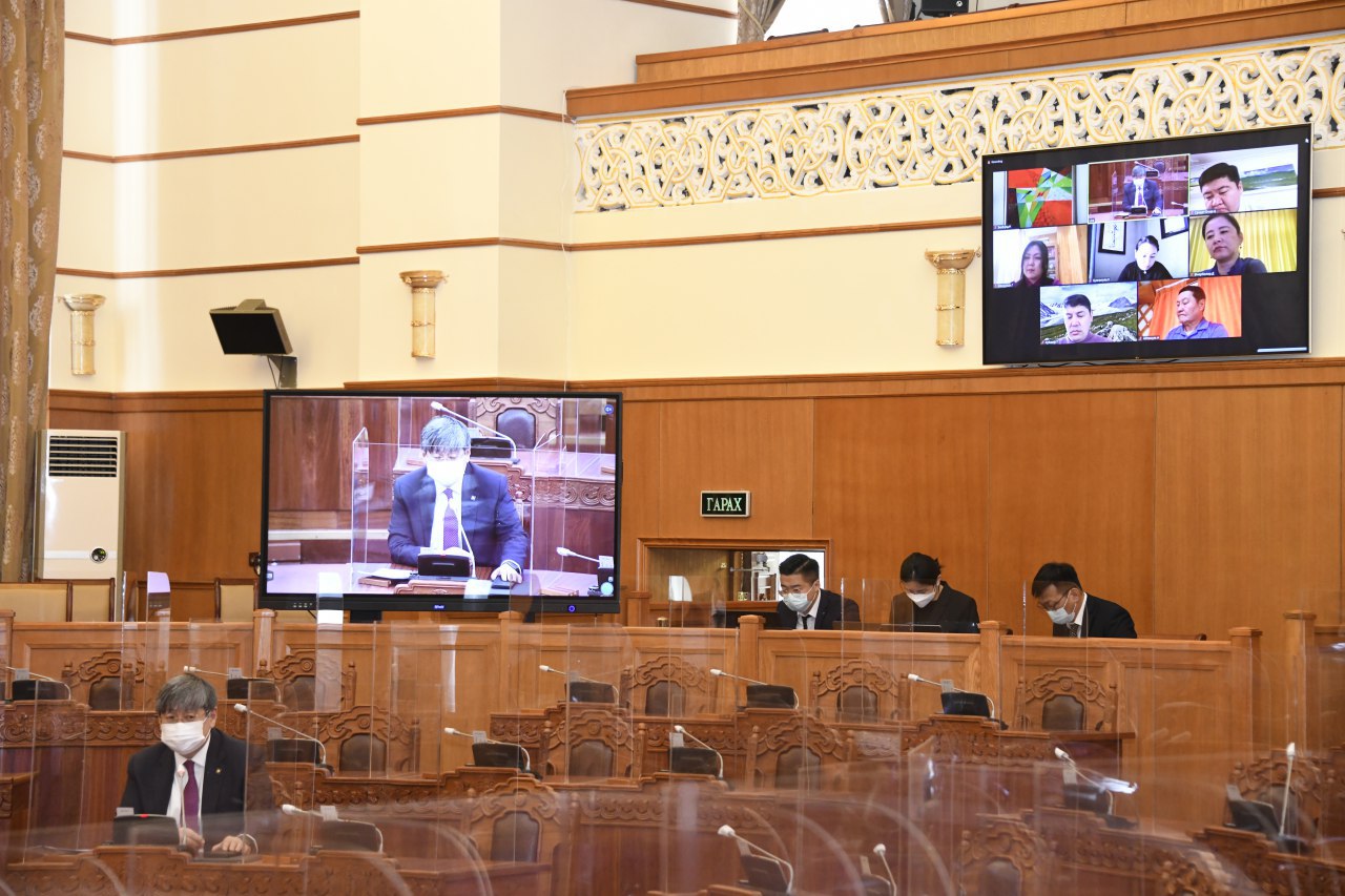 Улсын Их Хурлын 2021 оны хаврын ээлжит чуулганы өнөөдрийн (2021.04.23) нэгдсэн хуралдаан 10 цаг 03 минутад гишүүдийн 53.3 хувь нь ирцэд бүртгүүлснээр цахимаар эхэлж, хуралдааныг Улсын Их Хурлын дэд дарга Т.Аюурсайхан даргалан хуралдуулав. Нэгдсэн хуралдаанаар хоёр асуудал хэлэлцэж шийдвэрлэлээ.