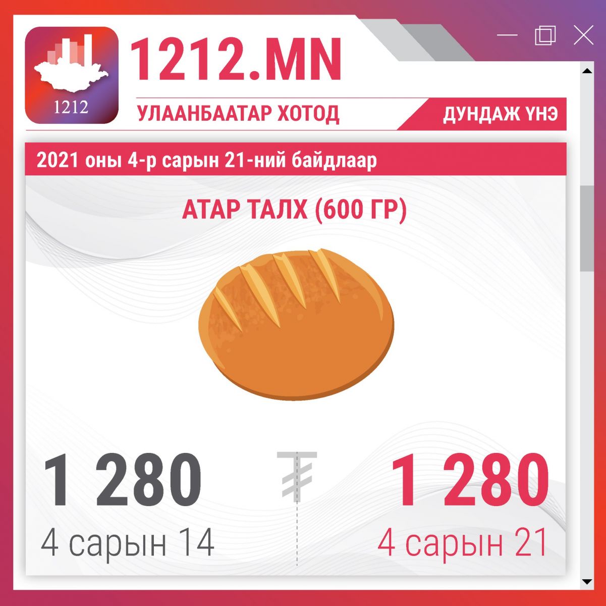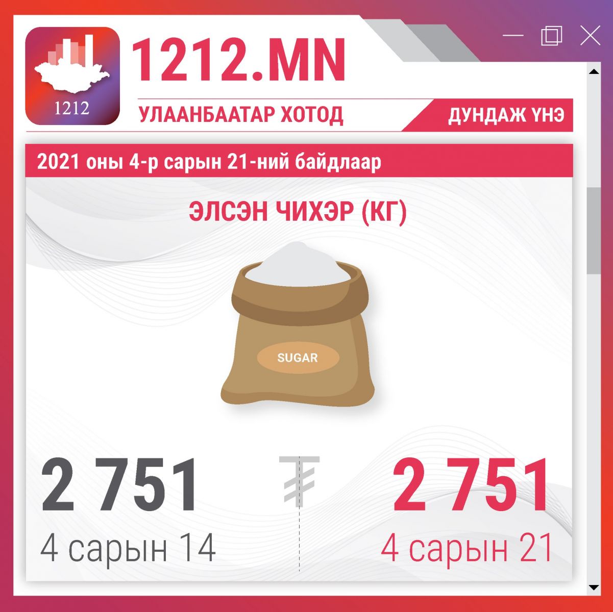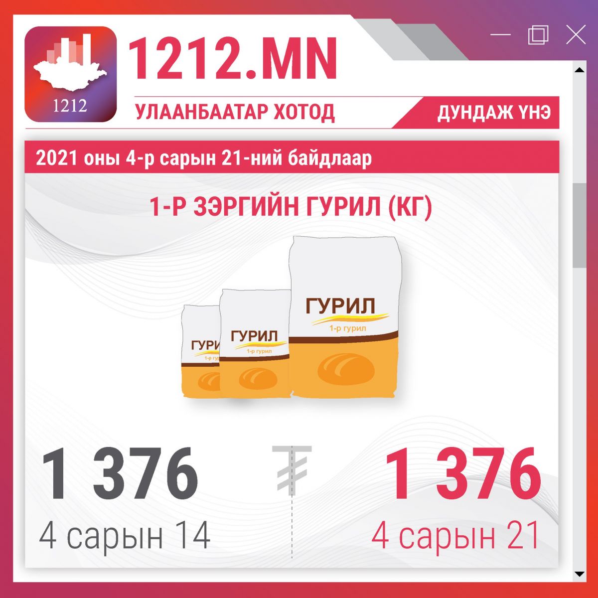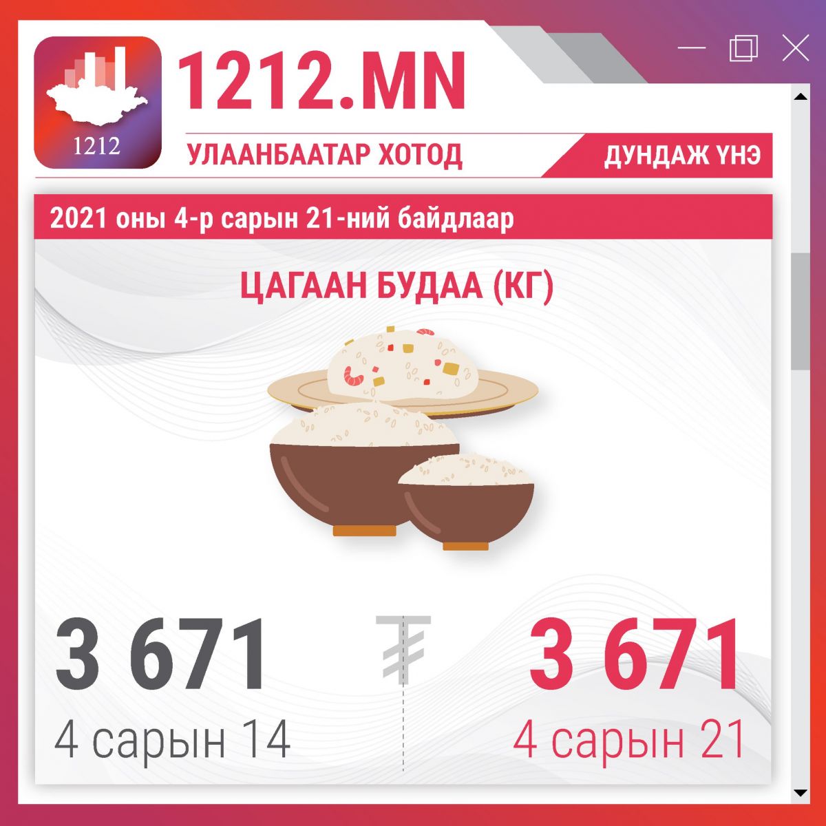 Улаанбаатар хотод худалдаалагдаж буй зарим гол нэрийн барааны дундаж үнийг танилцуулж байна. 2021 оны дөрөвдүгээр сарын 21-ний байдлаар гол нэрийн барааны үнэ өмнөх сараас 6.5 хувиар өссөн бол, өмнөх долоо хоногоос өөрчлөлтгүй байна гэж ҮСХ-ноос мэдээллээ.