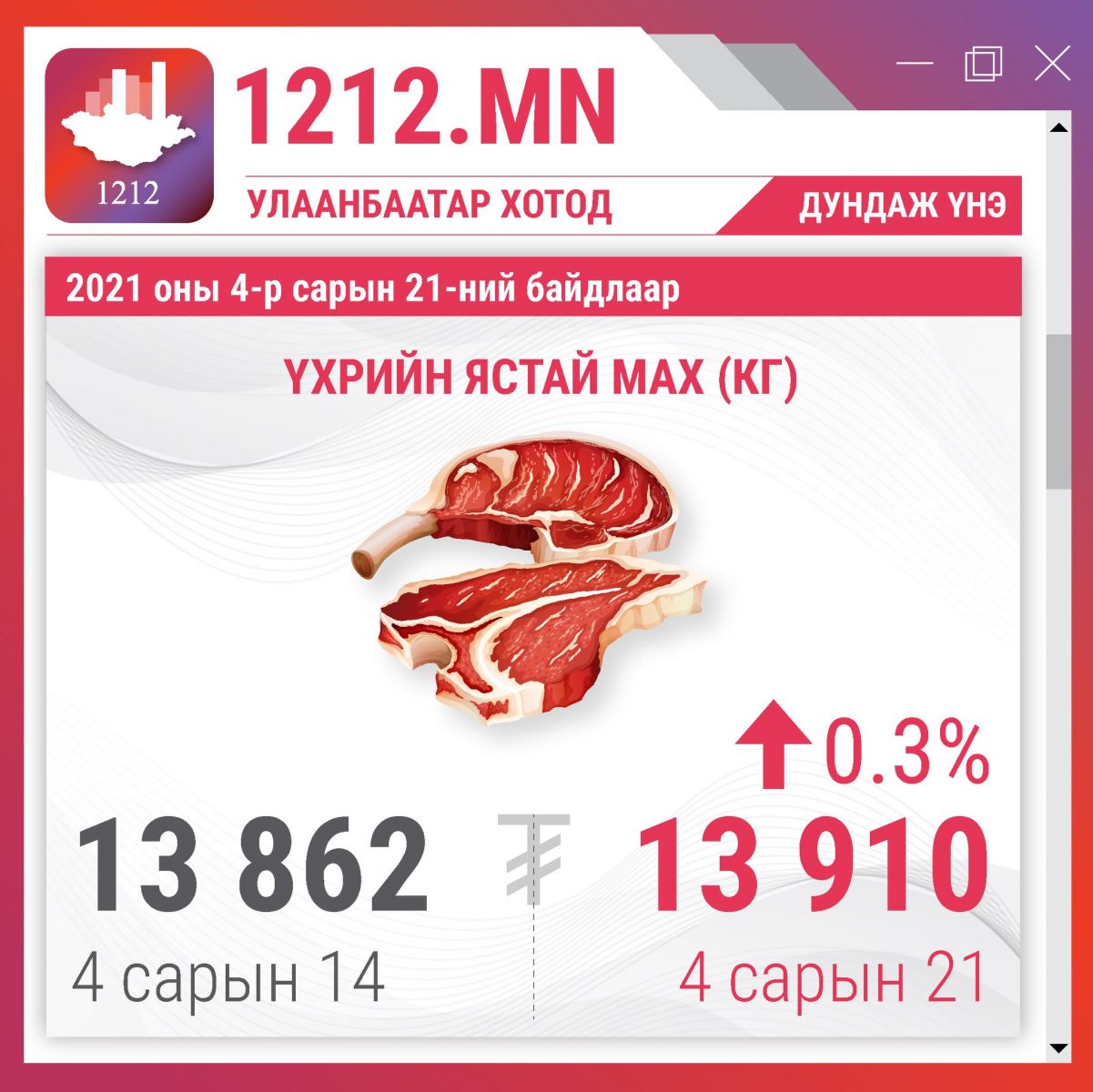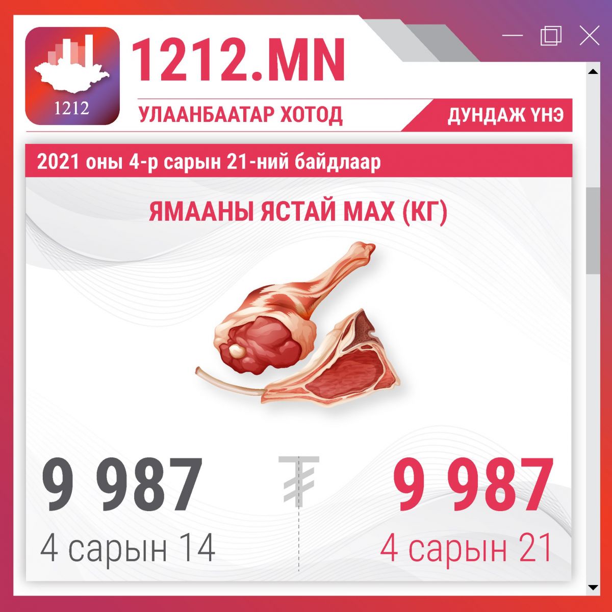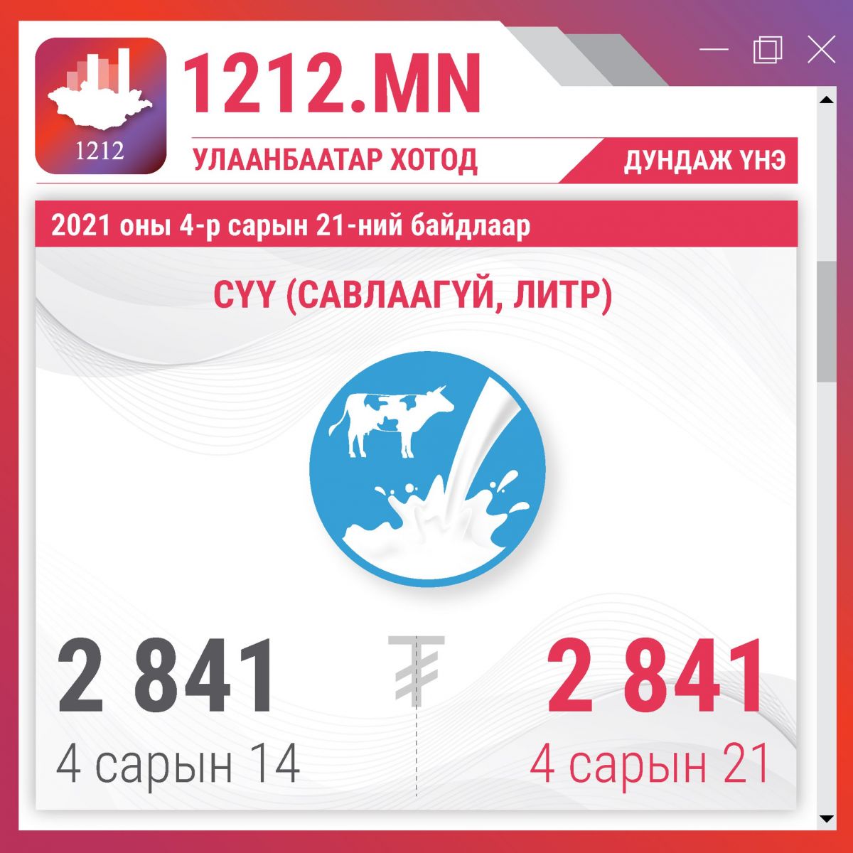 Улаанбаатар хотод худалдаалагдаж буй зарим гол нэрийн барааны дундаж үнийг танилцуулж байна. 2021 оны дөрөвдүгээр сарын 21-ний байдлаар гол нэрийн барааны үнэ өмнөх сараас 6.5 хувиар өссөн бол, өмнөх долоо хоногоос өөрчлөлтгүй байна гэж ҮСХ-ноос мэдээллээ.