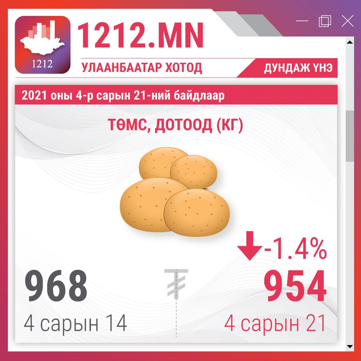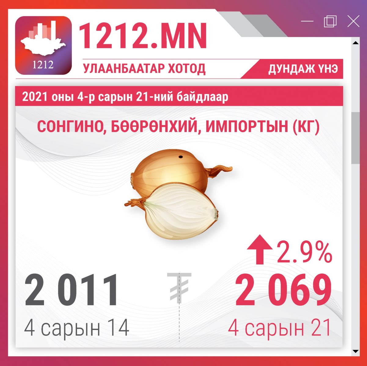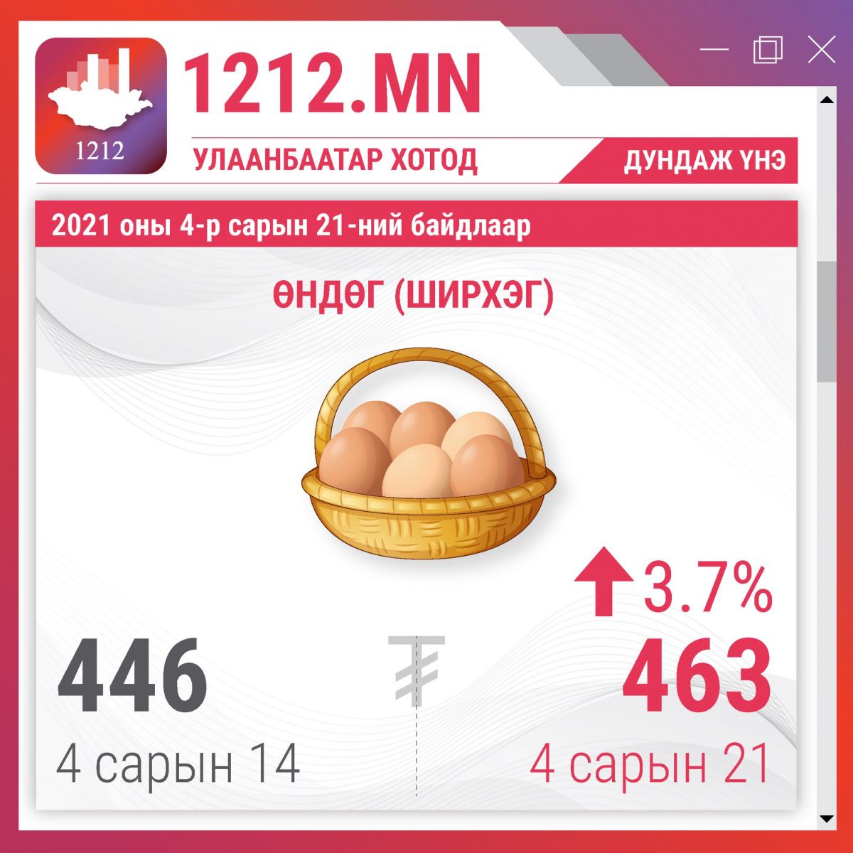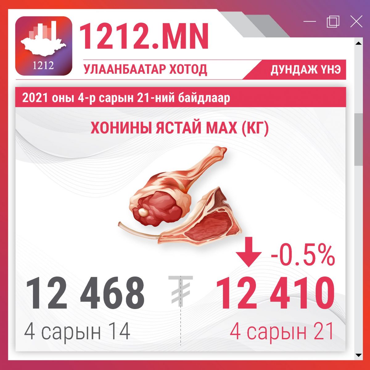 Улаанбаатар хотод худалдаалагдаж буй зарим гол нэрийн барааны дундаж үнийг танилцуулж байна. 2021 оны дөрөвдүгээр сарын 21-ний байдлаар гол нэрийн барааны үнэ өмнөх сараас 6.5 хувиар өссөн бол, өмнөх долоо хоногоос өөрчлөлтгүй байна гэж ҮСХ-ноос мэдээллээ.