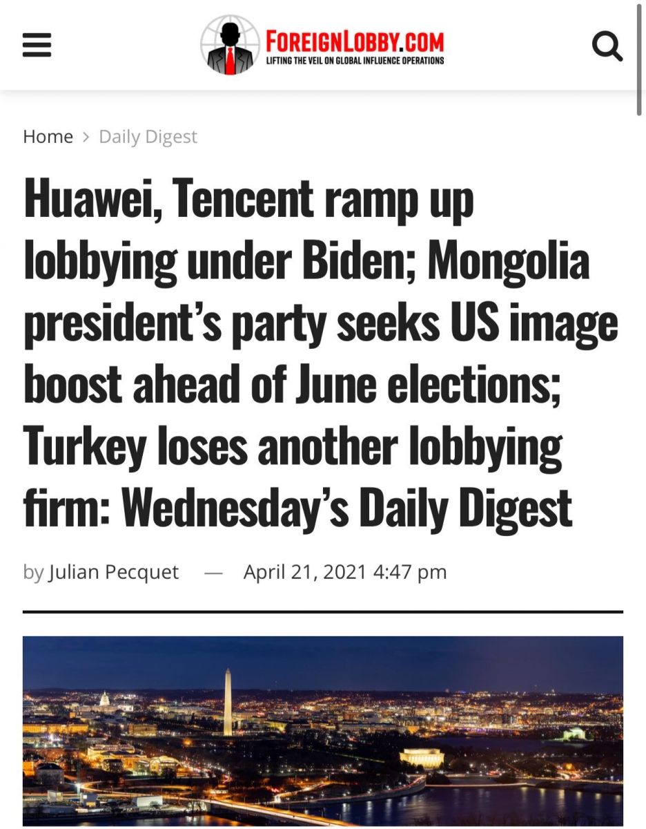 АНУ-ын Засгийн газрын мэдээллийн сан болон бусад олон нийтийн баримт бичгийг судалж, дэлхийн улс орнуудын Засгийн газар, компаниуд, хувь хүмүүсийн Конгресс, гүйцэтгэх засаглалтай холбоотой хууль бус мэдээлэл, лоббиг ил болгодог “Foreign Lobby Report” байгууллагын сайт дээр Хорват, Украин, Монгол тэргүүтэй улс, “Huawei Technologies”, “FGH Holdings”, “Tencent”, Тик Токийн эзэмшигч “ByteDance”, “Alibaba” зэрэг компаниуд АНУ-ын РR-ын компаниас дэмжлэг хүссэн тухай мэдээлжээ. Тэгвэл Монгол Улсын Ерөнхийлөгчийн сонгогдсон нам буюу Ардчилсан намын РR компаниас дэмжлэг хүссэн тухай тус сайтад “Монголын гол сөрөг хүчин Ардчилсан нам ирэх зургадугаар сарын 9-ний өдөр болох Ерөнхийлөгчийн сонгуулийн өмнө одоогийн Ерөнхийлөгч Халтмаагийн Баттулгыг “Монголын ардчиллын загвар” болгон сурталчлах зорилгоор DCI хэмээх PR хийдэг компанийг хөлсөлжээ. Гэрээ нь 50 мянган долларын өртөгтэй бөгөөд PR болон лобби нь хоёр сар үргэлжлэх юм байна. Энэ сарын 12-нд DCI-ийн гүйцэтгэх захирал Дуглас Гудиер болон Ардчилсан намын дэд дарга Цэвээндоржийн Туваан нар гарын үсэг зурж гэрээ байгуулжээ. Харин гэрээний өртөг болох 50 мянган ам.доллар DCI-ийн дэд ерөнхийлөгч Кевин Айверс, түнш Райан Грилло нарын дансанд орсон байна. Х.Баттулга нь өнгөрсөн жилийн сонгуульд үнэмлэхүй ялалт байгуулсан МАН-ын дарга Ухнаагийн Хүрэлсүхтэй Ерөнхийлөгчийн сонгуульд өрсөлдөхөөр байгаа юм. Монгол Улсын Ерөнхийлөгч Х.Баттулга нь МАН-ыг татан буулгах зарлигийг дөрөвдүгээр сарын 18-ны ням гарагт гаргасан билээ” хэмээжээ.