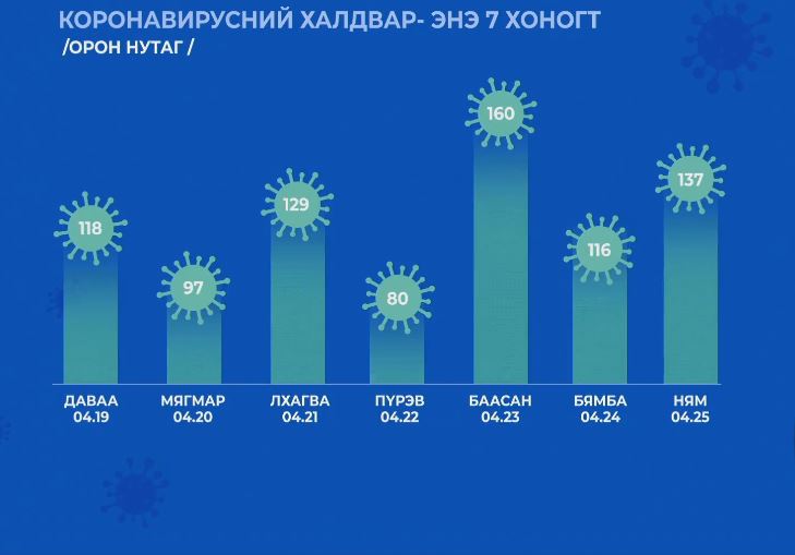 Сүүлийн 24 цагт улсын хэмжээнд 1264 хүнээс коронавирусний халдвар илэрч, 4 хүн нас баржээ. Батлагдсан тохиолдлуудын 1127 нь Улаанбаатар хотоос, 137 нь орон нутагт бүртгэгдлээ. Улсын хэмжээнд халдвар авсан нийт тохиолдлын тоо 30.483 боллоо.