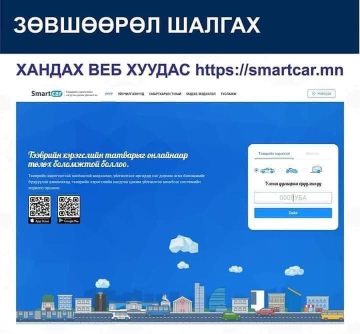 Smartcar.mn хуудсаар орж, хүсэлтээ өгөөд QR кодоо хэвлэн авах боломжтой.