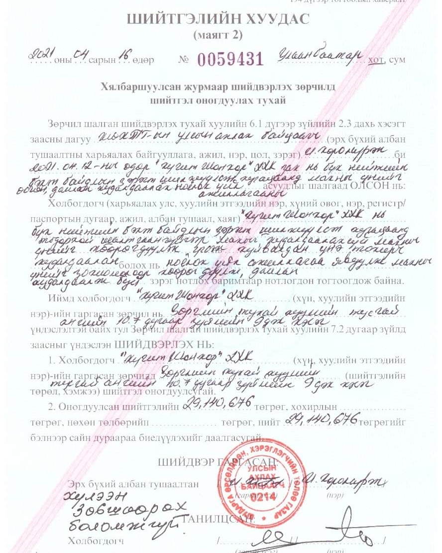 Ингэхдээ махны үнийг зохиомлоор хөөрөгдүүлж, дамлан худалдаалж буй нь нотлох баримтаар тогтоогдсон тул жилийн борлуулалтын орлогын 4%-иар буюу 29,140,676 (Хорин есөн сая нэг зуун дөчин мянга зургаан зуун далан зургаан) төгрөгөөр торгожээ.