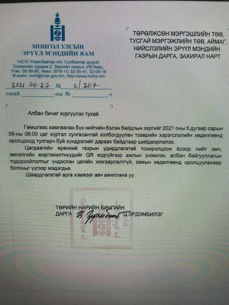 Тэгвэл Эрүүл мэндийн яам Цагдаагийн ерөнхий газрын удирдлагуудтай тохиролцсоны дагуу нийт эмч, эрүүл мэндийн байгууллагын ажилтнуудыг ажлын үнэмлэх, албан байгууллагын тодорхойлолт үндэслэн QR кодгүйгээр замын хөдөлгөөнд оролцуулахаар шийдвэрлэжээ.
