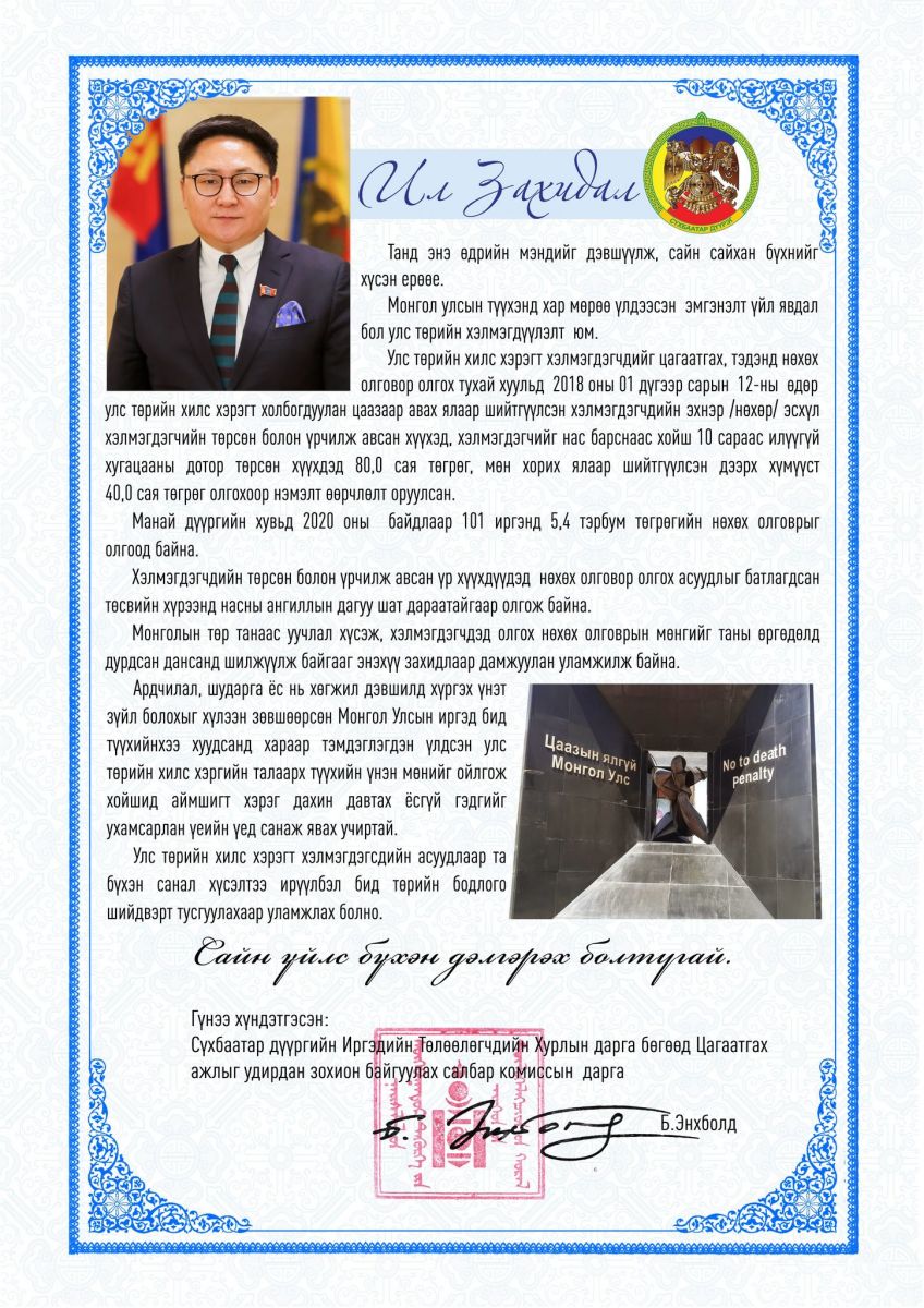 Сүхбаатар дүүргийн Иргэдийн Төлөөлөгчдийн Хурлын дарга бөгөөд Цагаатгах ажлыг удирдан зохион байгуулах салбар комиссын дарга Б.Энхболдын хэлмэгдэгсдийн үр хүүхдүүдэд илгээсэн “Ил захидал”-ын хүргэж байна.