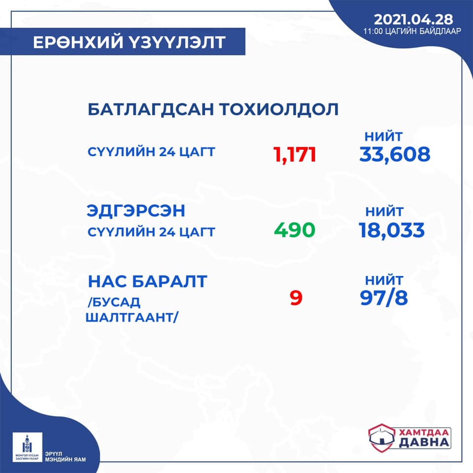 Мөн хугацаанд 9 хүн нас барсан харамсалтай мэдээлэл байна. Ингэснээр нас баралтын тохиолдол 97 боллоо.