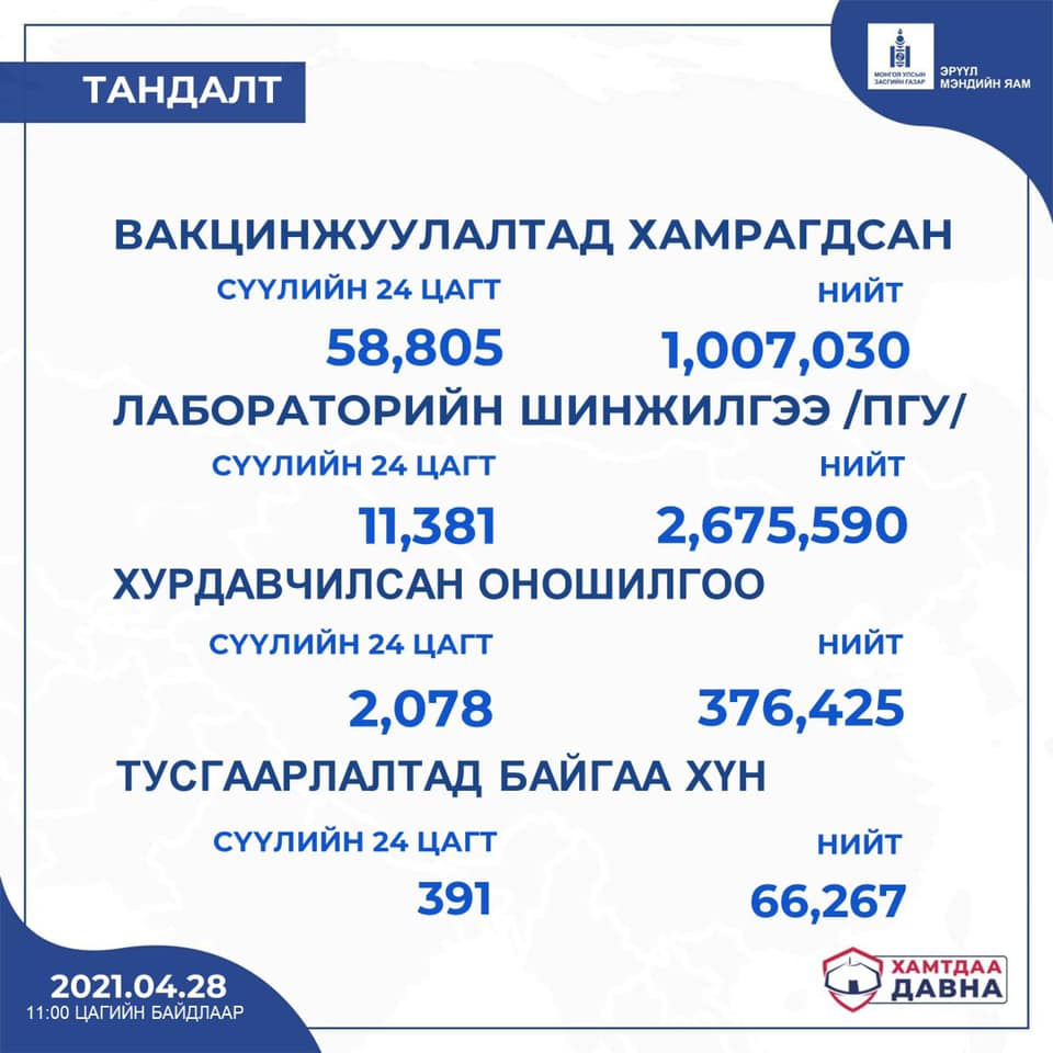 Эрүүл мэндийн яамнаас коронавирусний тархалт, нөхцөл байдлын талаар мэдээлэл хийж байна. (2021.04.28)
