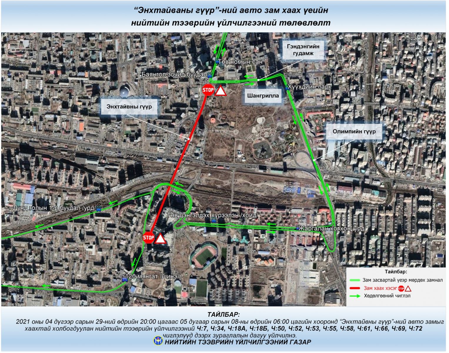 Тодруулбал, дээрх хугацаанд Энхтайваны гүүрээр зорчдог 13 чиглэлийн нийтийн тээврийн хэрэгслийг Олимпийн гүүр, Гэндэнгийн гудамжаар /эсрэг урсгал/ зорчуулахаар хөдөлгөөн зохион байгуулалтыг хийлээ.