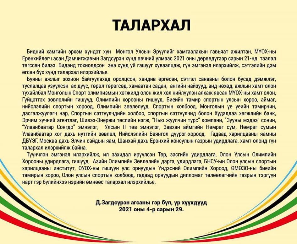 Спортын нэрт зүтгэлтэн таалал төгссөнд ОУОХ, Азийн Олимпын Зөвлөл тэргүүтэй олон улсын байгууллага, хувь хүмүүсээс эмгэнэлийн захидал ирсээр байна.
