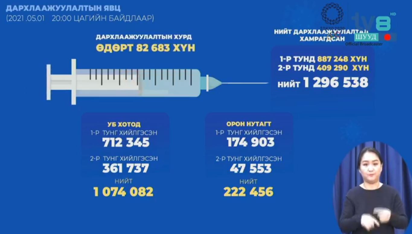 Улаанбаатар хотод 1.1 сая иргэн вакцинжуулалтад хамрагдах шаардлагатай байгаа аж. Өнгөрсөн 24 цагийн хугацаанд манай улсад 82 мянга гаруй иргэн вакцинд хамрагджээ.