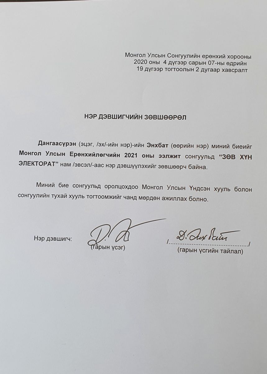 Тэгвэл "Зөв хүн электорат" эвслээс "Датаком" компанийн үүсгэн байгуулагч Д.Энхбатад эвслээс нэр дэвших санал тавьсан.