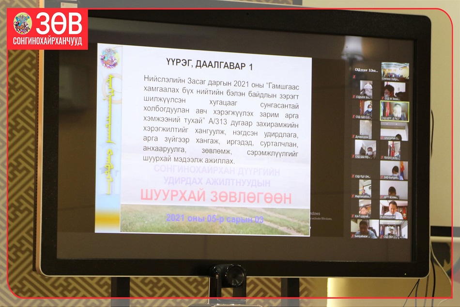 Сонгинохайрхан дүүргийн удирдах ажилтнуудын ээлжит шуурхай зөвлөгөөн өнөөдөр /2021.05.03/ цахимаар хуралдав. Хурлыг Сонгинохайрхан дүүргийн Засаг дарга Н.Алтаншагай удирдан явууллаа.
