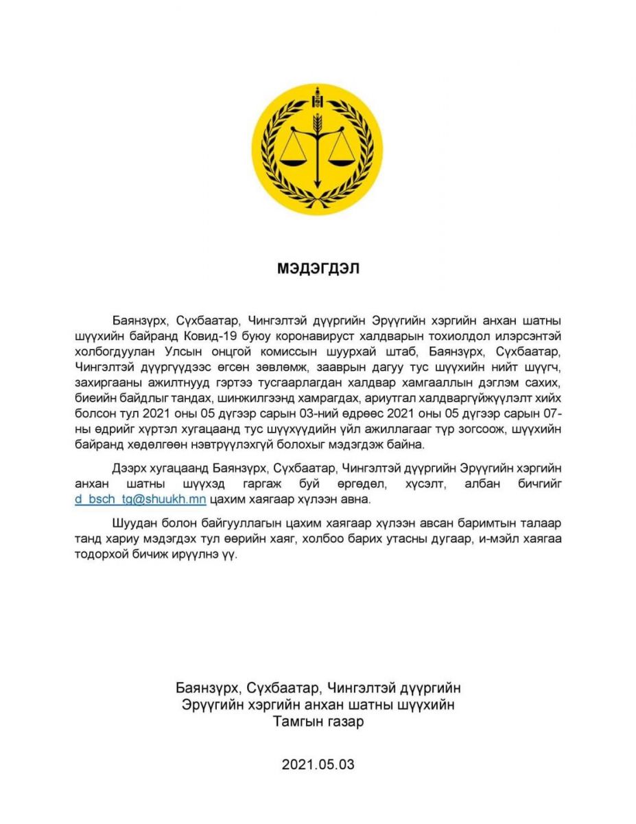 Тодруулбал, тус шүүхэд коронавирусний халдвар илэрсэнтэй холбоотойгоор шүүгч нар , шүүхийн ажилтнууд гэрийн тусгаарлалтад орсон учраас тавдугаар сарын 7-ны өдөр хүртэл шүүхийн байранд хөдөлгөөн нэвтрүүлэхгүй болсон байна. Түүнчлэн дээрх хугацаанд товлогдсон шүүх хурлууд хойшилж байгаа ба албан бичгийг цахимаар хүлээн авахаар болжээ.