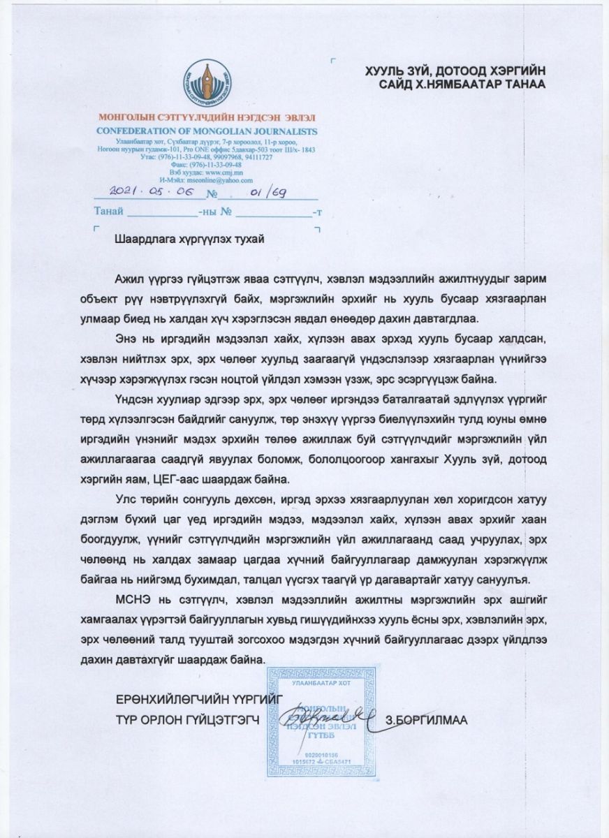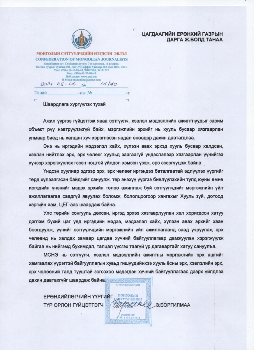 Монголын Сэтгүүлчдийн нэгдсэн эвлэл (МСНЭ)-ээс сэтгүүлчийн биед халдсан асуудлаар Хууль зүй, дотоод хэргийн сайд Х.Нямбаатар, Цагдаагийн ерөнхий газрын дарга Ж.Болд нарт ШААРДЛАГА хүргүүллээ.