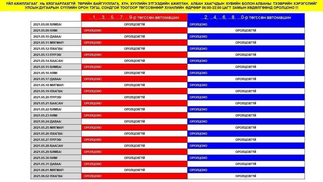 Үйл ажиллагааг нь хязгаарлахгүй төрийн байгууллага, хүн, хуулийн этгээдийн ажилтан, албан хаагчдын хувийн болон албаны тээврийн хэрэгслийг улсын дугаарын сүүлийн орон тэгш, сондгой тоогоор төгссөнөөр хуанлийн өдрөөр  (хүнс, эмнэлгийн тусламж үйлчилгээ, буяны үйлчилгээ, инженерийн байгууламж хот нийтийн аж ахуйн ажил, хэвлэл мэдээлэл, тусгай зориулалтын техник хэрэгслээс бусад) 06:00-22:00 цагт замын хөдөлгөөнд оролцуулах юм.
