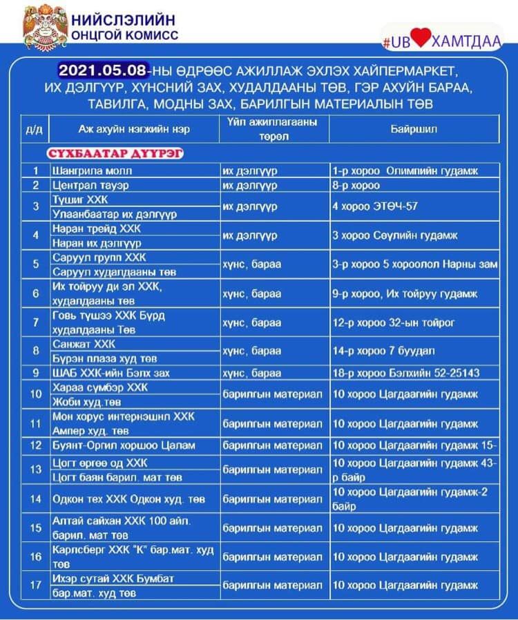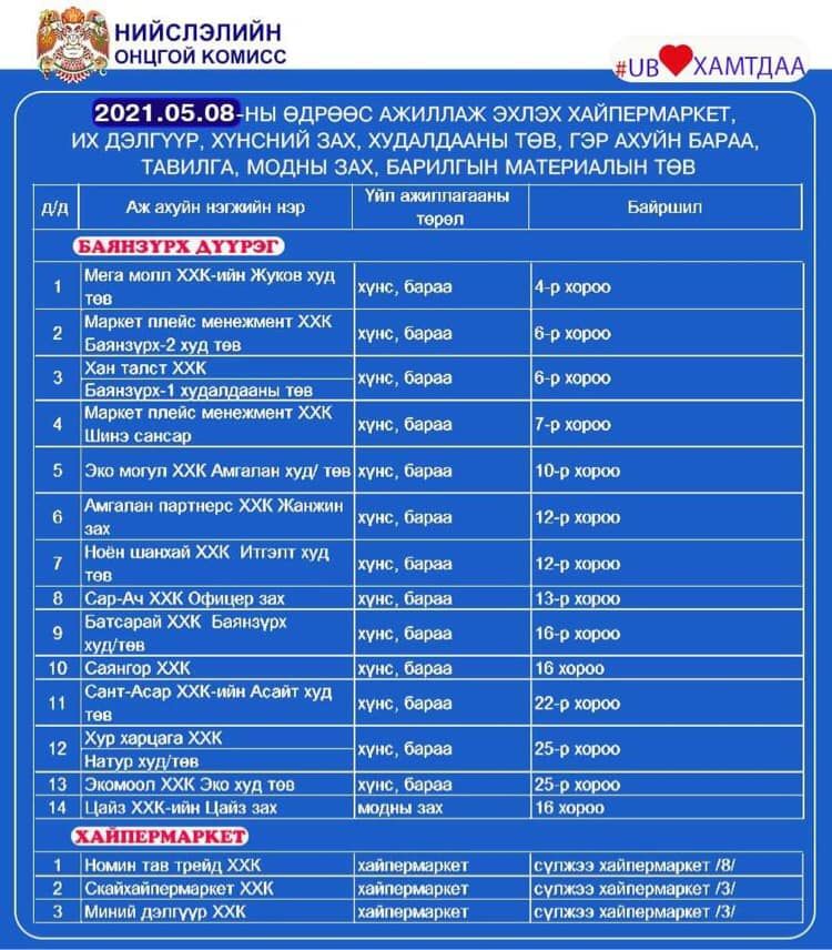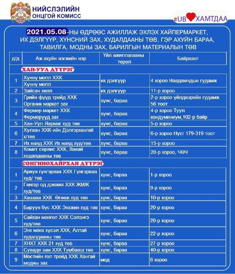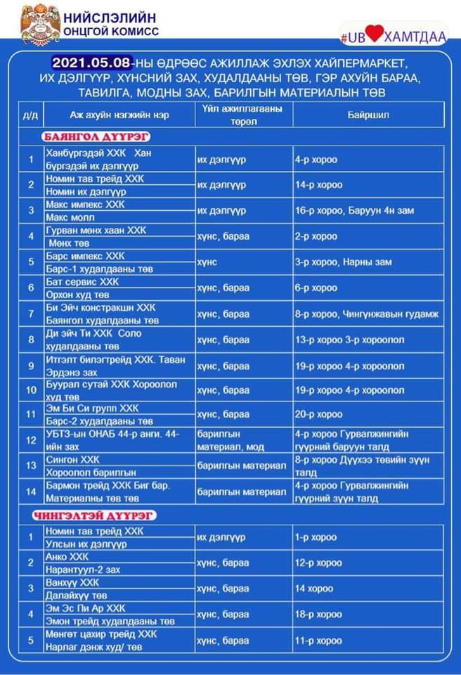Тавдугаар сарын 8-ны 06:00 цагаас улсын хэмжээнд Бүх нийтийн бэлэн байдлын зэргийг бууруулж, өндөржүүлсэн бэлэн байдлын зэрэгт шилжүүлсэн. Халдвар хамгааллын дэглэмийг нэг түвшин бууруулсантай холбогдуулан зах, худалдааны төвүүдийг үе шаттайгаар нээж байна. Үйл ажиллагаа явуулж байгаа худалдаа, үйлчилгээний байгууллагуудыг танилцуулъя.