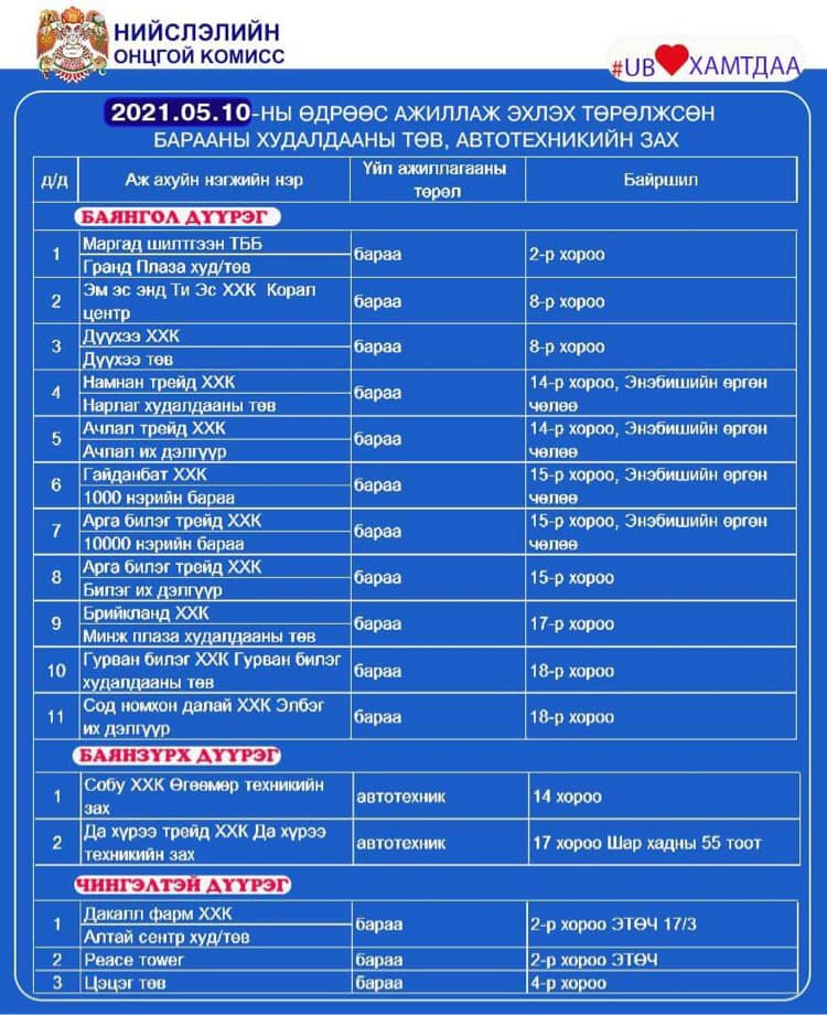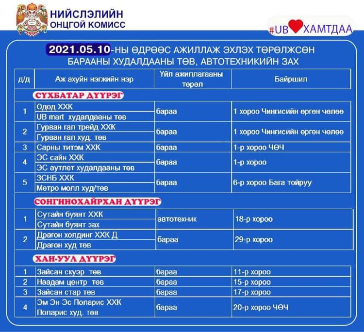 Харин маргаашнаас буюу тавдугаар сарын 10-наас төрөлжсөн барааны худалдааны төв, авто техникийн зах, төвүүдийг нээх юм.