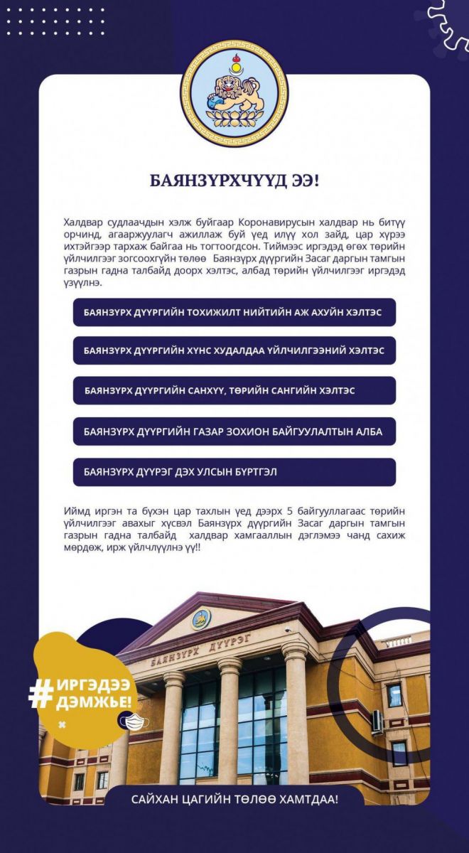 Ингэхдээ иргэдийн хамгийн ихээр үйлчлүүлдэг зарим хэлтсийг Баянзүрх дүүргийн Засаг даргын тамгын газрын гадна байрлуулж, халдвар хамгааллын дэглэм мөрдүүлж, үйл ажиллагаа явуулахаар Баянзүрх дүүргийн Онцгой комиссоос төлөвлөлөө.