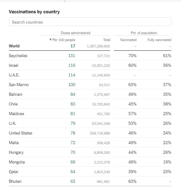 “The New York Times”-ын тавдугаар сарын 10-нд шинэчилсэн дата мэдээллээр Монгол Улсын ковидын эсрэг дархлаажуулалтаар дэлхийд 12 дугаарт жагсаж байна. Тавдугаар сарын 1-нд 19 дүгээрт эрэмбэлэгдэж байсан. Тэгвэл арав хоногийн хугацаанд ийнхүү долоон байраар урагшиллаа.